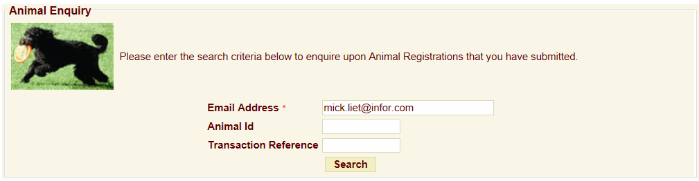 AnimalEnquiry.aspxThe Animal Enquiry function is accessible from the ?Animals? menu group and is used to allow a user to enquire upon the status of an animal that they have previously submitted (registered) for processing.