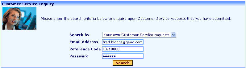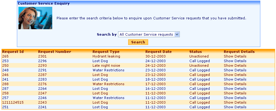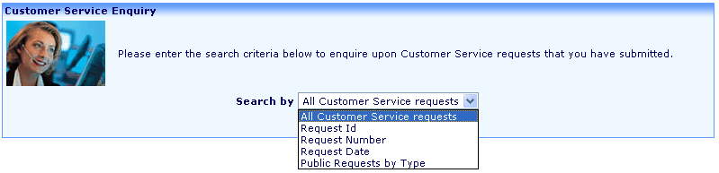CustomerServiceEnquiry.aspxThe Customer Service Enquiry function is accessible from the ?Customer Service? menu group and is used to allow a user to enquire upon the status of a request that they have previously submitted (lodged) for processing.