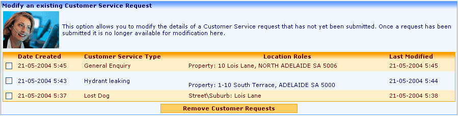 Any unwanted requests can be Removed by first selecting the check box, then selecting the <Remove Customer Requests> button. In the example below one request has been selected for removal.