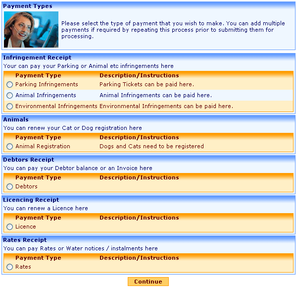 This Payment Types page provides instructional text and allows the user to select the type of payment that they wish to make. In the example below a variety of types are available for payment ? including Parking Infringements, Animal Renewals, Debtor payments and Rates payments.